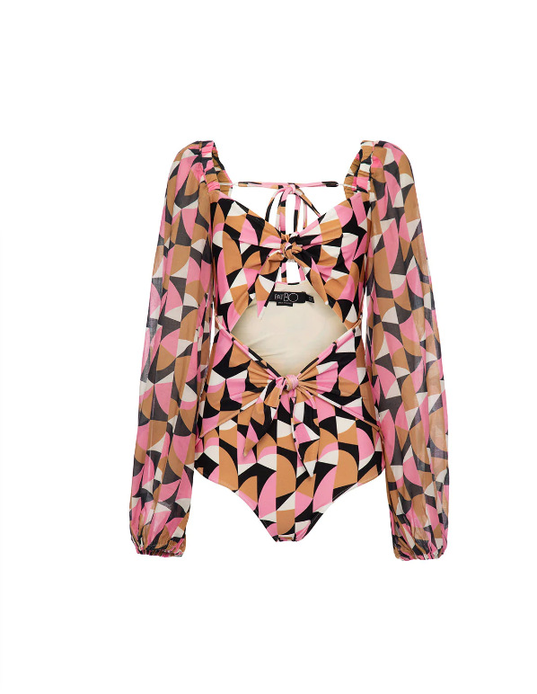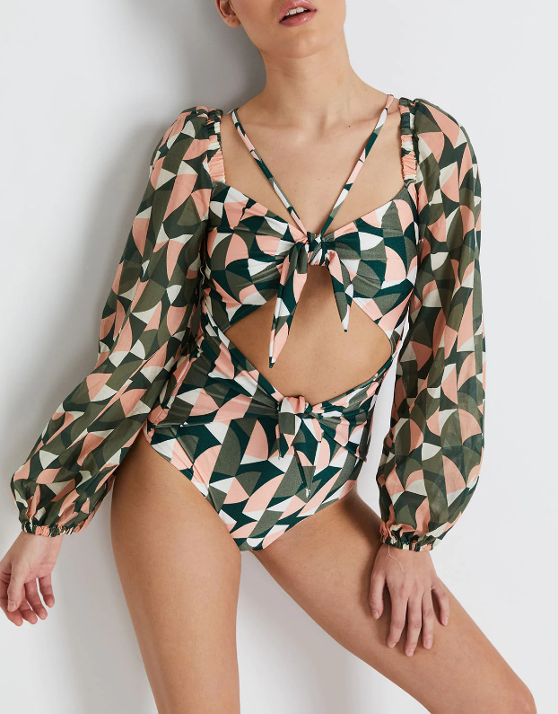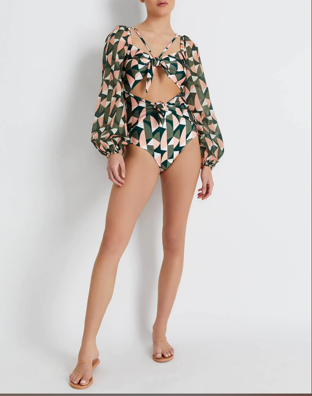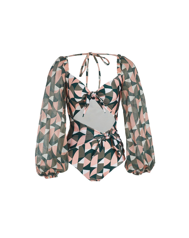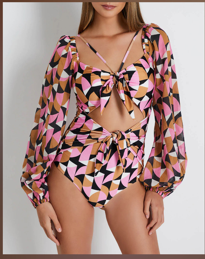 Breathable mesh long sleeved jumpsuit bikini printed deep V high waisted swimsuit