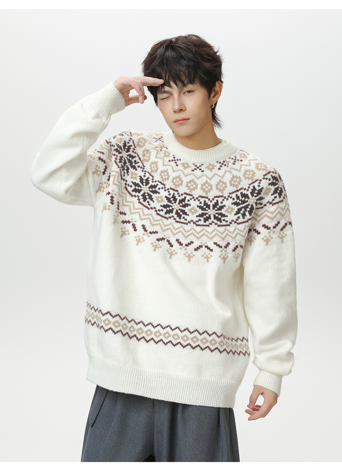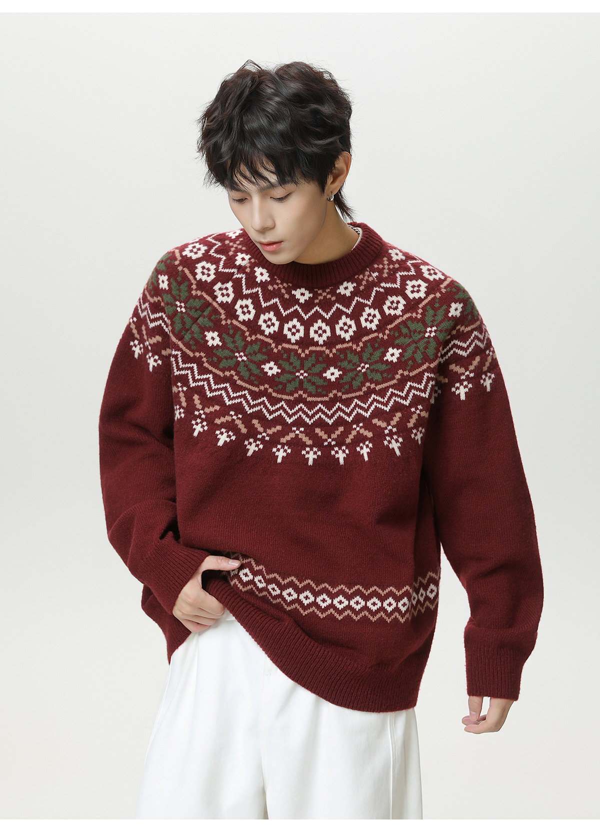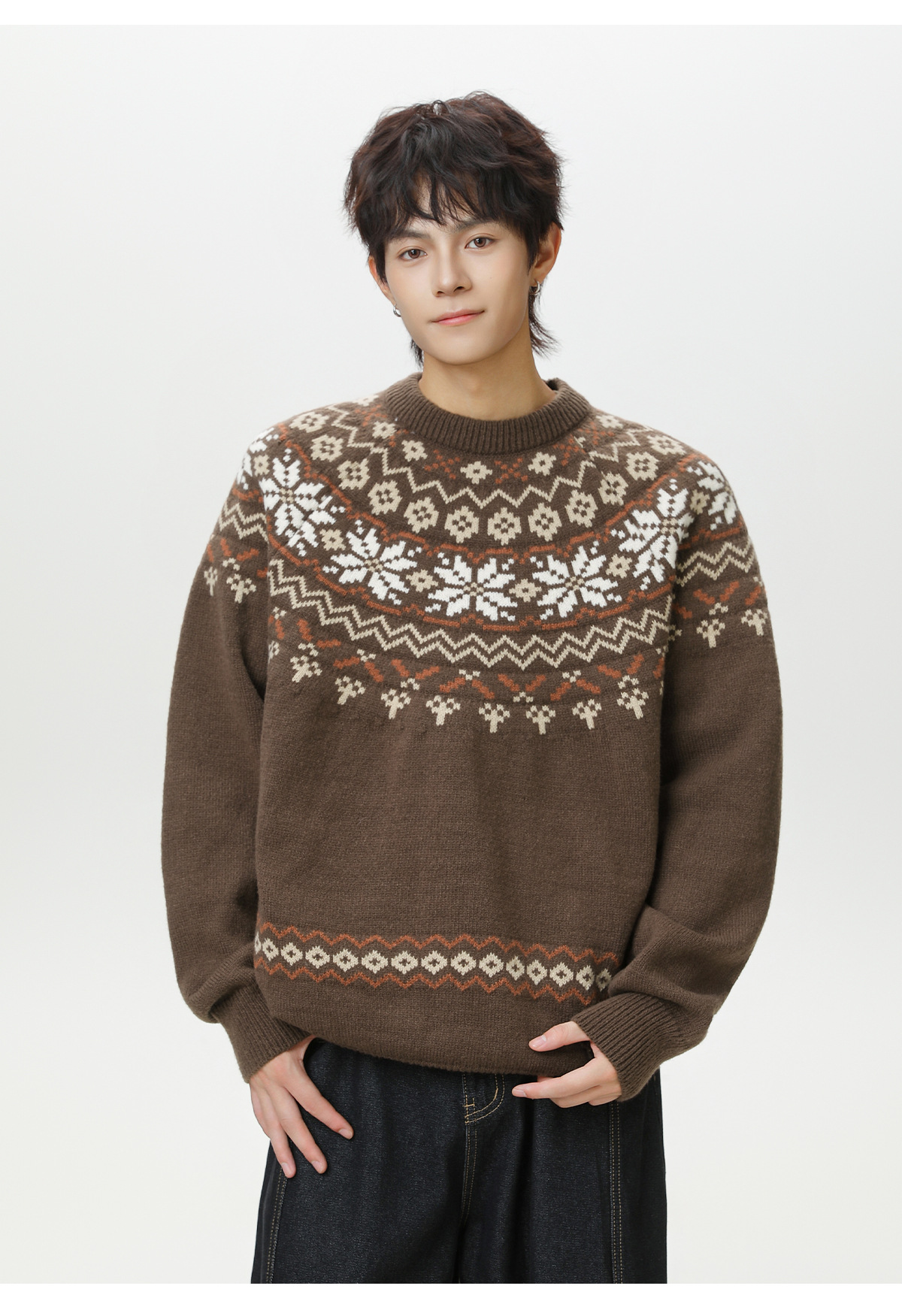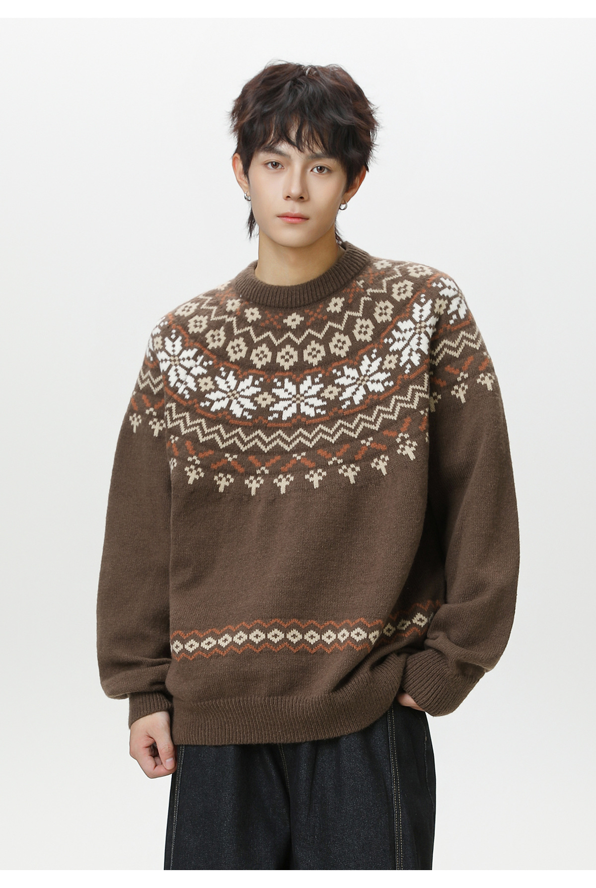 Ethnic style round neck sweater for men